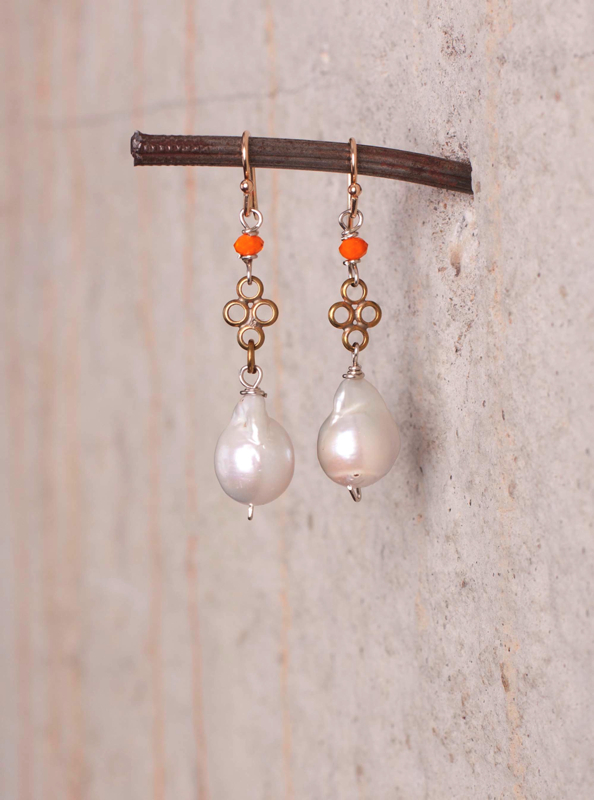 Fresh Water Pearl / Orange Quartz / Bronze Chain