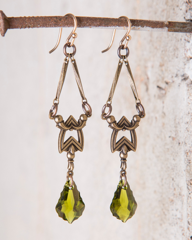 Olivine Austrian Crystal / Deco Finding / Brass Bronze Elements /14kt. G.F. French Wires / 2 3/4"Length