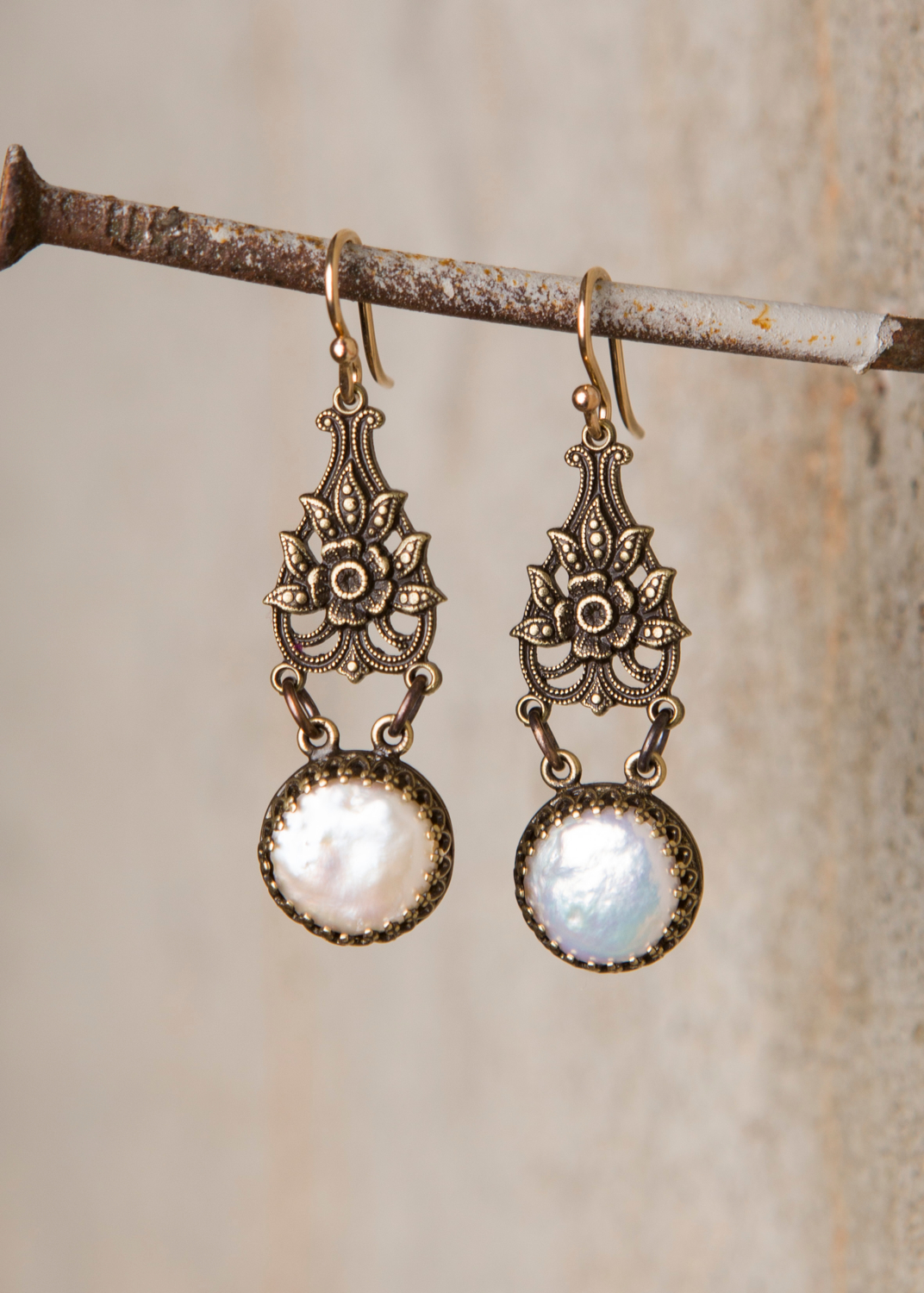 Fresh Water Pearl Drop Earring / Brass & Bronze Elements / 14kt. G.F. French Wires / 1 3/4" Length
