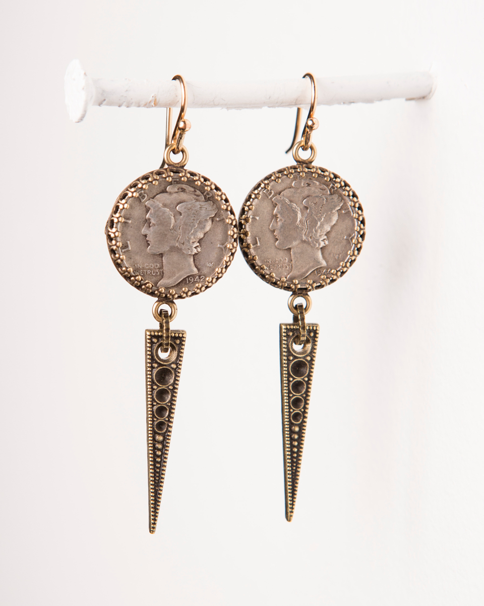 Vintage Silver Mercury Dime / Bronze Spike 2.5" Length / 14kt. G.F. French Wires