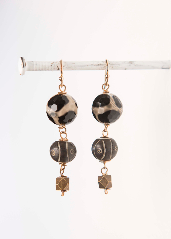 Black/Brown Faceted Bead Drop / Bronze & Brass Elements / 2" Length / 14kt. G.F. French Wires