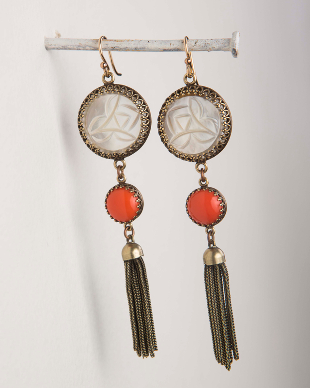 Vintage Carved Mother of Pearl / Vintage Orange Cabochon / 3.5" Length / 14kt. Gold Finish French Wires