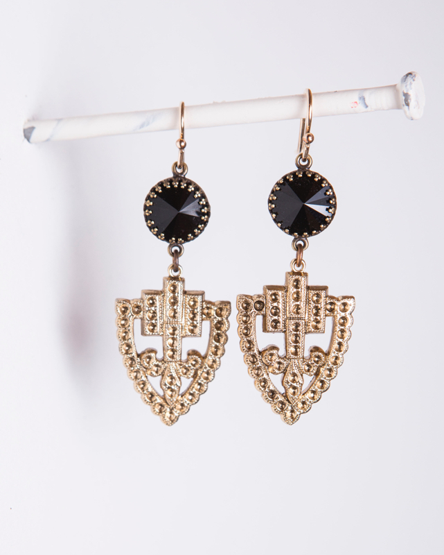 Austrian Jet Crystal / Plated Gold Shield 2" Length / Length / 14kt. G.F. French Wires