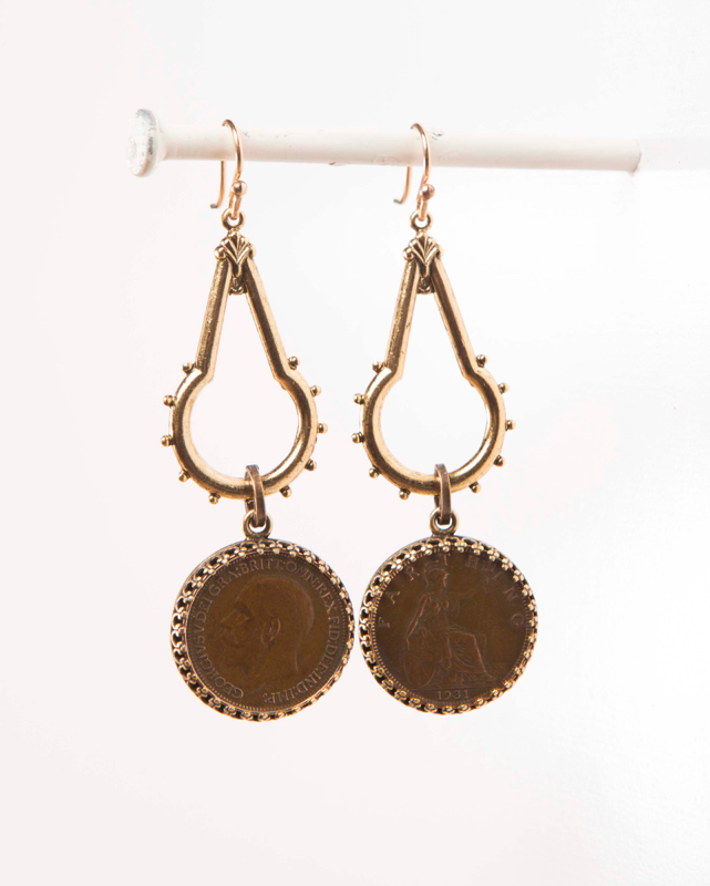 Vintage British Farthing Coin / Plated Gold Teardrop Finding / 2.5" Length / 14kt. G.F. French Wires