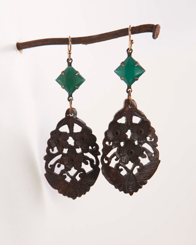 Hand Carved Teardrop / Vintage Square Green Stone / 3"Length / 14kt. G.F. French Wires