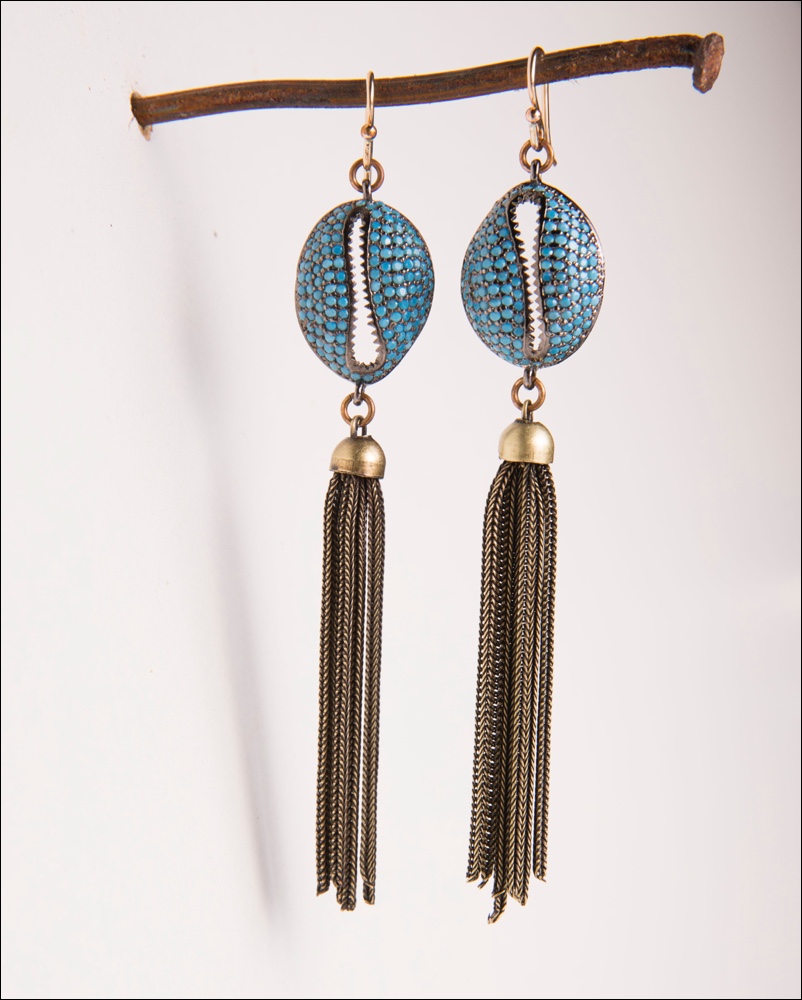 Turquoise Gunmetal Cowrie Shell / Tassel 3.5" Length / 14kt. G.F. French Wires