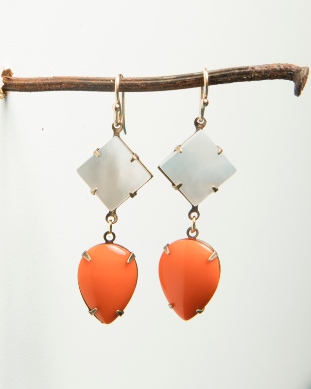 Vintage Orange Cabochon / Square MOP 2" Length / 14kt. G.F. French Wires