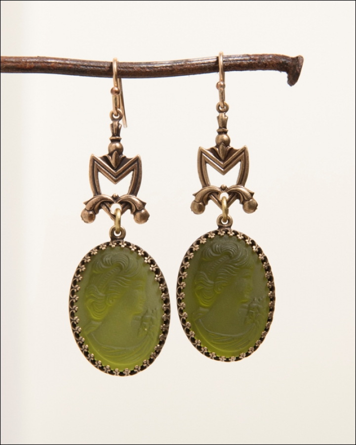 Olivine Cameo Cabochons / Plated Gold Shield / 2 1/4"L/14kt.G.F.French Wires
