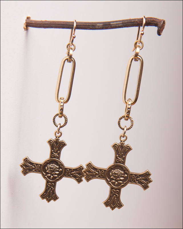 Ornate Cross Pendant Earrings / Plated Gold / 14kt.G.F, French Wires / 3" L