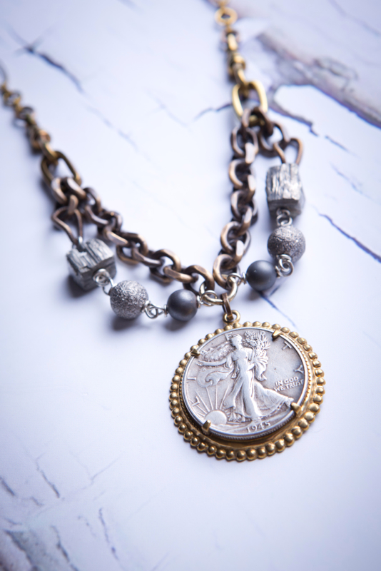 Vintage Recylced Liberty Half-Dollar / Pyrite / Brushed Hematite / Wear Long or Choker / 34"Length