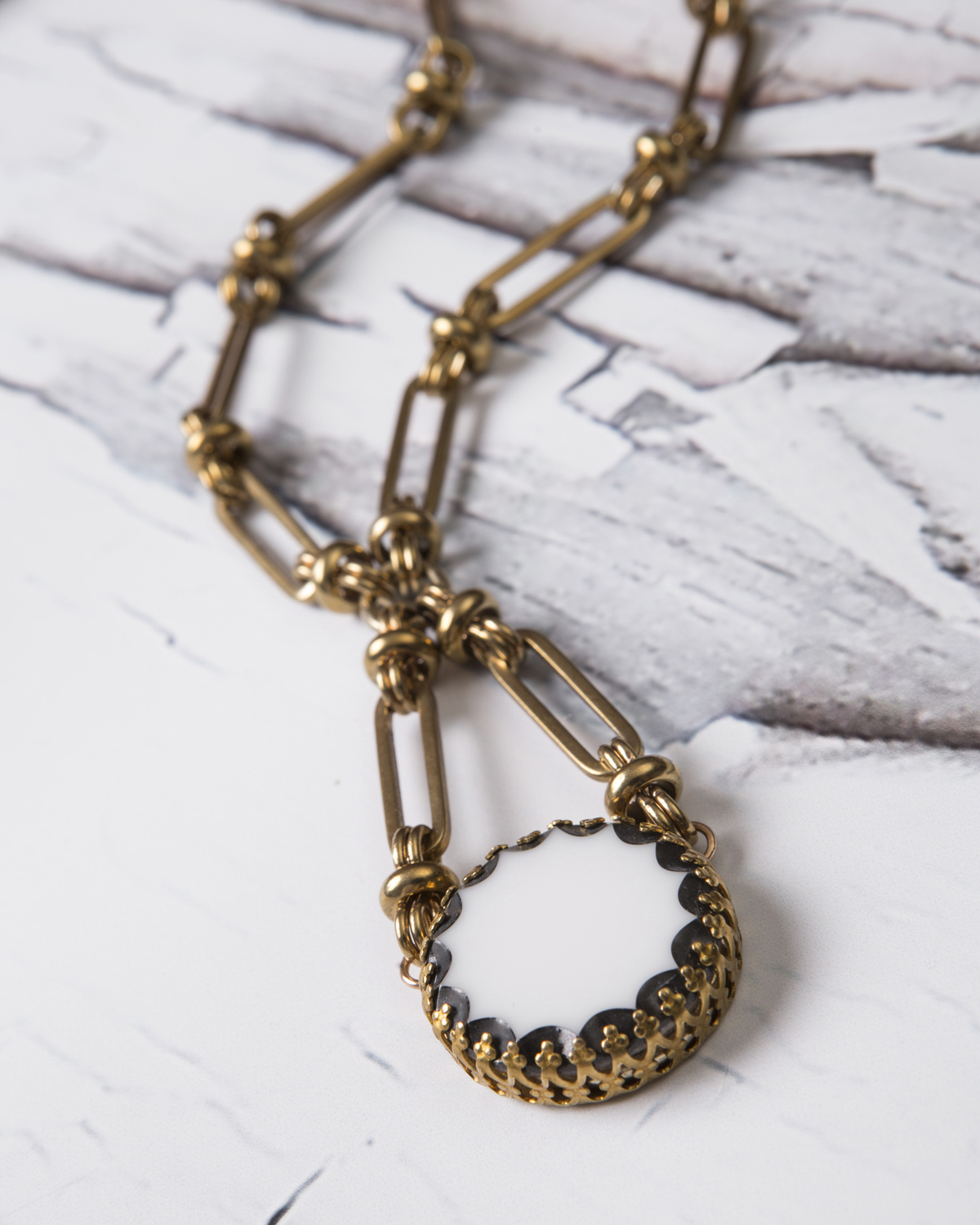 Vintage Recycled Milk Glass Cabochon /Heavy Brass Chain / 15-18.5" Adjustable Length
