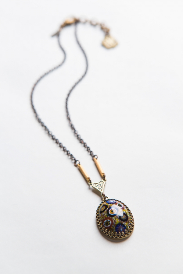 Vintage Venetian Glass Cabochon / Brass & Bronze Chain/Elements / 15.5 to 17" Adjustable Length