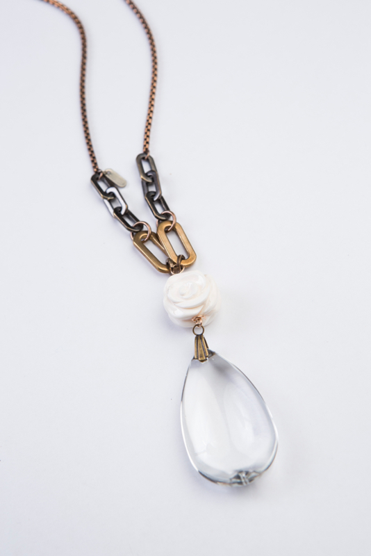 Pink Rose Shell Cabochon / Chandelier Crystal / Bronze Chain / 32" Length/Wear Long or Choker