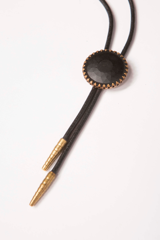Vintage Black Leather Cameo Back / Brass Tip Bolo / 36" Length