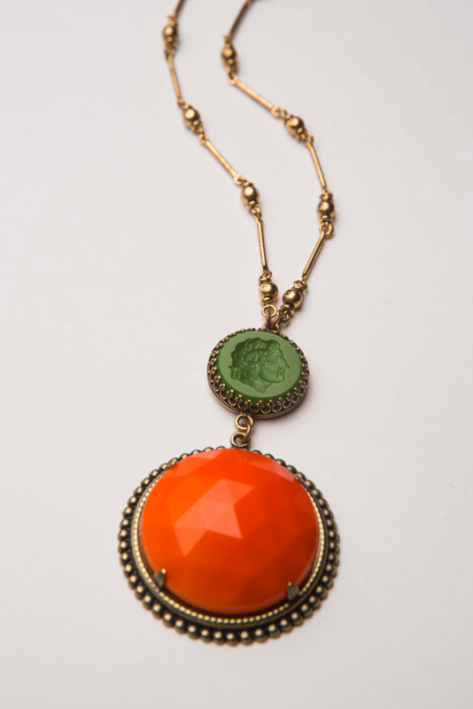 Vintage Hat Pin Cabochon & Intaglio / Plated Gold Chain / 23" Length