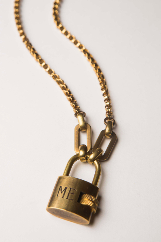 Hand Engraved ME Vintage Lock / Plated Gold Chain / 13.5-17" Adjustable Length / Double as Bracelet