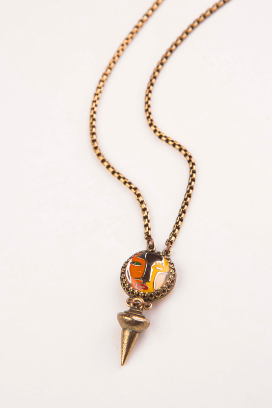 Vintage Picassoesque Button / Plated Gold Bronze Chain / 16-18" Adjustable Length