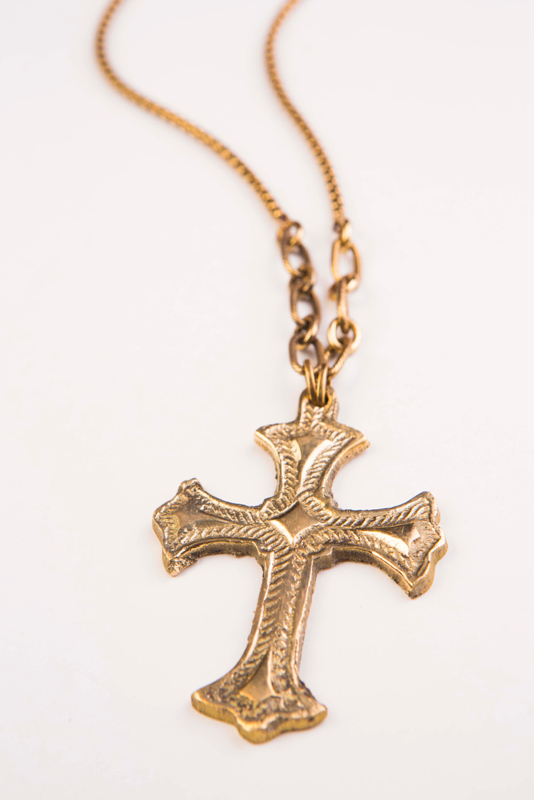 Cast Brass Cross / Plated Gold Bronze Chain / Smoky Carved Quartz / Wear Long or Double as Choker / 34" L
