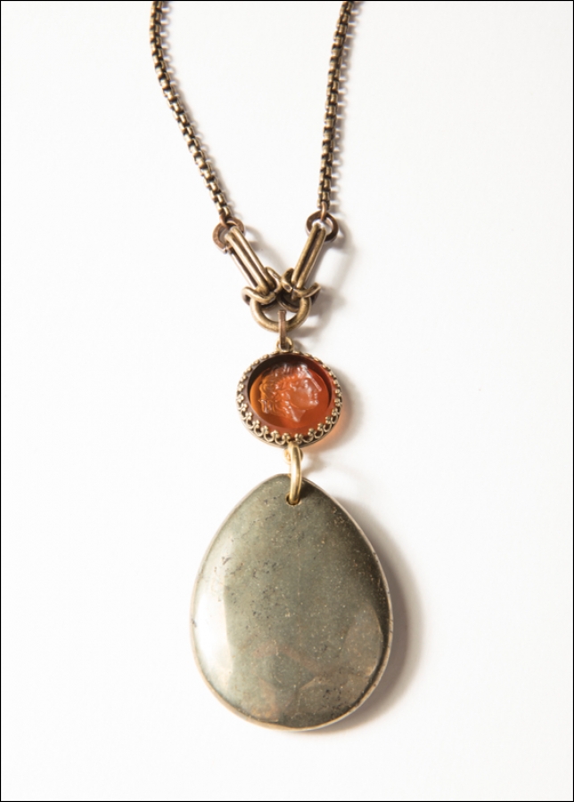Vintage Intaglio Cameo / Pyrite Drop. Bronze Chain / 33.5" Length